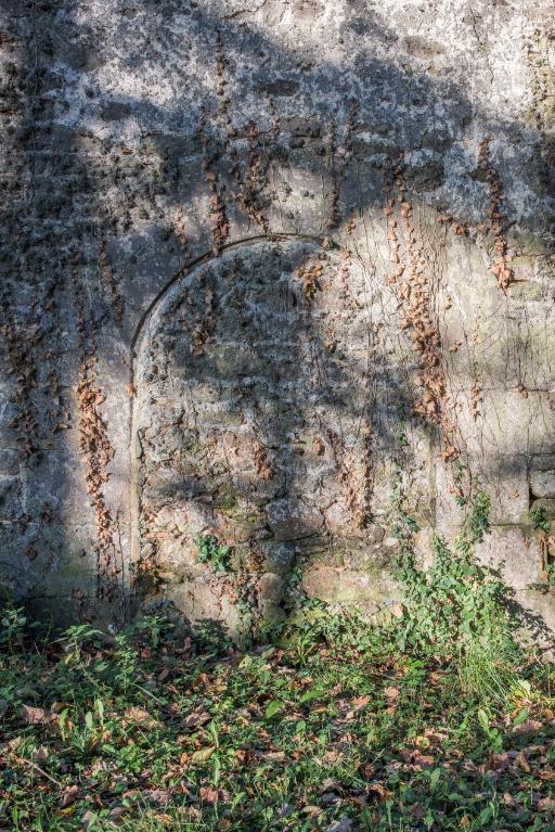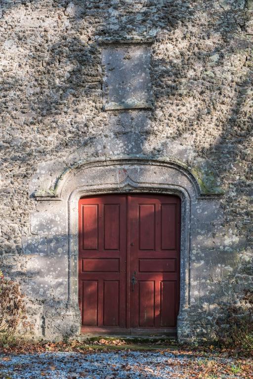 La porte principale, est ornée sur son pourtour d'une moulure en accolade et surmontée d'un larmier en anse de panier. Un campanile surmonte le mur pignon ouest, dont les crossettes présentent des traces de sculptures.