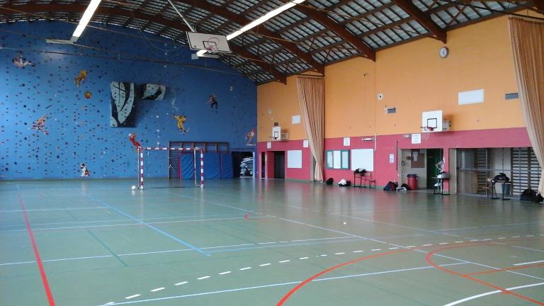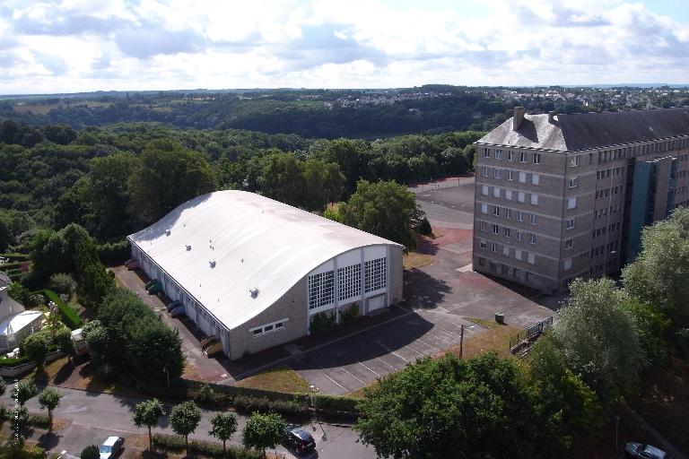 Le gymnase diffère des autres bâtiments du lycée par sa toiture sinusoïdale, affectant la forme d'une vague. Cette forme implique une couverture spéciale en tôle préformée à recouvrement, reposant sur une charpente, constituée de onze pannes en bois lamellé-collé, qui dessine le tracé de la toiture. La hauteur sous plafond, au point le plus haut, est de 11 m. Le contreventement, permettant de stabiliser certaines parties de l'ouvrage, est peu commun. En effet, la mise en œuvre d'écharpes entre les pannes, selon un axe de symétrie divisant le gymnase en deux offre un contreventement plus dense en périphérie de l'édifice, au niveau des pignons, qu'au centre de l'édifice. Les murs sont réalisés avec une structure portante en pilier béton avec remplissage en parpaings. Des parements en moellons de granite donnent un aspect monument à l'équipement. Le toit ne possédant pas d'éclairage zénithal, de larges ouvertures en façade sont nécessaires. De ce fait, en pignon ouest et en façade sud, des ouvertures en verre cathédrale fixées à l'aide de grilles de béton, permettent de profiter de la lumière naturelle. Par ailleurs, l'éclairage des deux salles (40 m x 20 m et 20 m x 11,5 m) que comporte le gymnase est complété par deux luminaires sur toute la longueur du bâtiment. Les quatre vestiaires-douches sont disposés sur le côté nord.