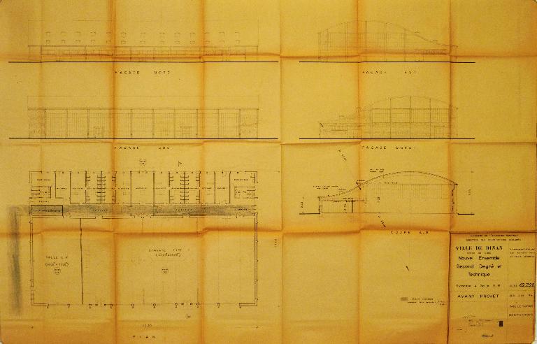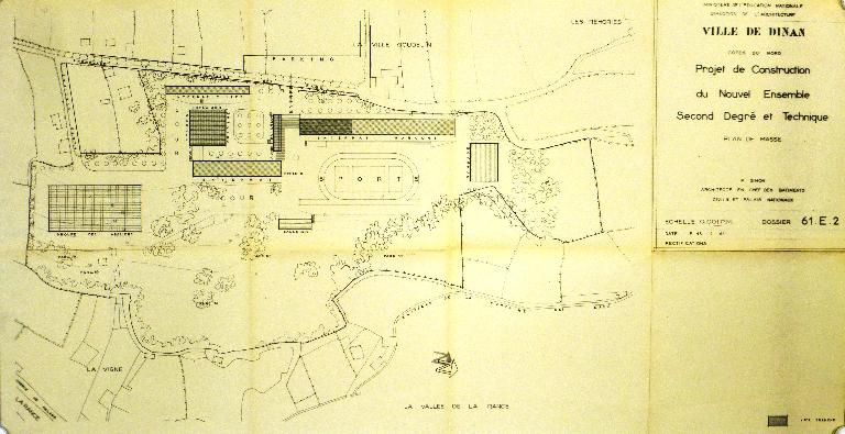 L'avant-projet de Patrice Simon, architecte en chef des Bâtiments civils et Palais nationaux, pour le nouvel ensemble second degré et technique de Dinan est approuvé par le conseil général des Bâtiments de France le 3 octobre 1961, et son second plan de masse le 3 avril 1962. Le gymnase est inauguré en 1966.