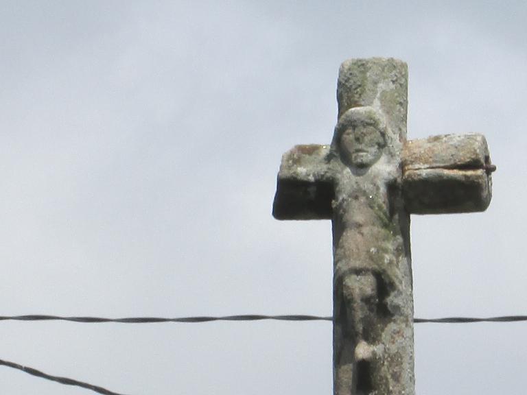 Croix de chemin en granite à long fût circulaire sur socle rectangulaire. Sur le croisillon, dont le bras gauche est brisé, un Christ au visage sommairement détaillé, bras tendus à l'horizontal, pieds alignés et périzonium court.