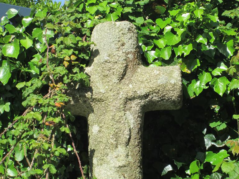 Croix monolithe en granite à bras courts et fût cylindrique sur socle carré et emmarchement à deux degrés. Christ très fruste.