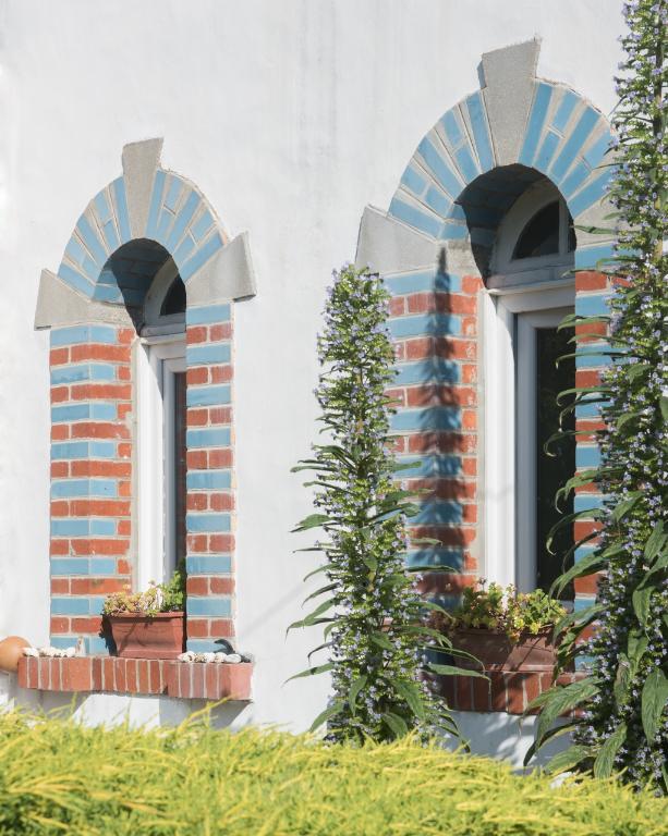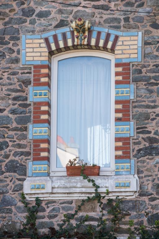 A l'origine, les murs en moellon de schiste étaient tous recouverts d'un enduit comme sur la façade sud. Les chaînages d'angle sont montés en brique tandis que les baies sont encadrées de briques vernissées et émaillées de diverses couleurs, certaines présentent un décor de bossages en pointes-de-diamant. Des clefs en bossage moulurée (ou agrafes) ornent les linteaux sur la façade principale au nord.