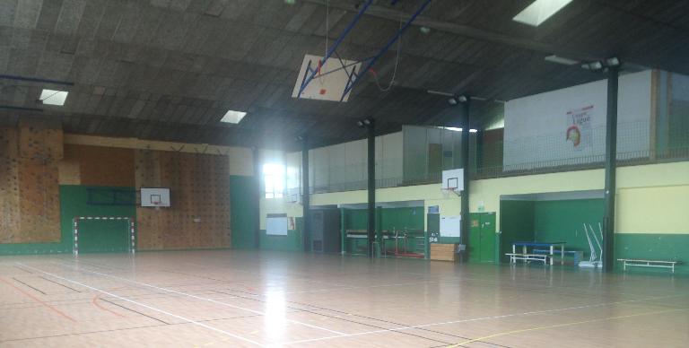Le gymnase de type C comporte une salle de 40 m x 20 m, une salle de jeux de 70 m2 environ avec hall d'entrée et des annexes fonctionnelles. L'ossature est constituée de béton et de métal. La charpente métallique, de section losangique, repose sur cette ossature composée de poteaux métalliques apparents à l'intérieur de la salle. Ce type de charpente a la particularité de limiter le risque de flexion. En outre, ces losanges sont facilement identifiables sur les façades latérales de l'édifice, d'un bel effet architectural, que valorise la différence de couleur entre le toit et les murs. Les seules ouvertures du complexe se trouvent en façade est ; à l'opposé, une mezzanine sert de tribune. Un mur d'escalade complète l'offre sportive de l'équipement.