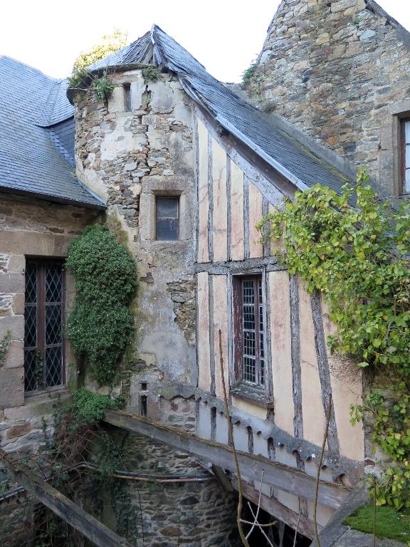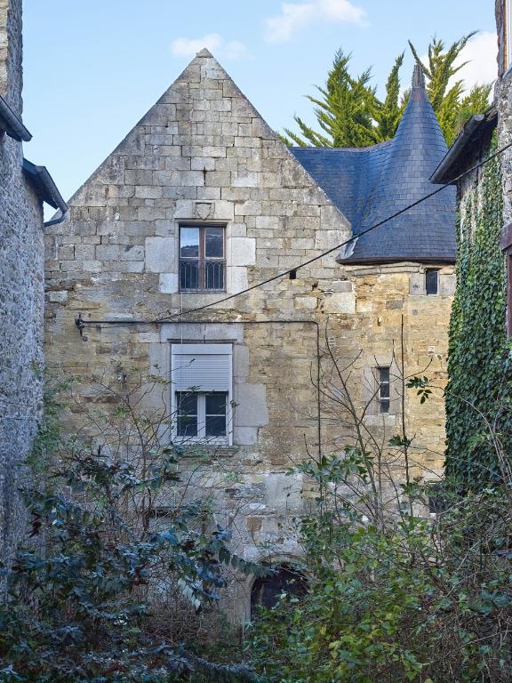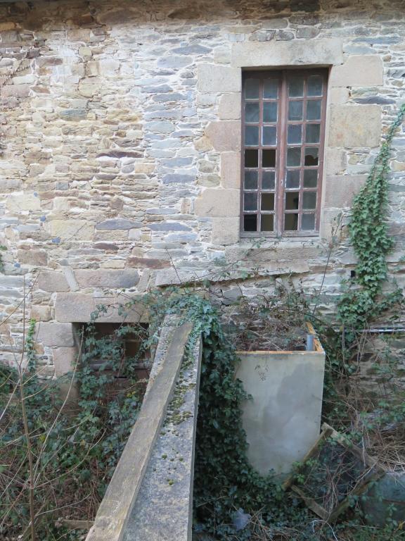 Au fond de la cour un grand corps de logis, composé d'une cuisine à cheminée ayant trois ouvertures de portes garnies de leurs vantaux, une ouverture de fenêtre, un potager à trois services de maçonnerie et une grande auge de pierre, au levant de la dite cuisine une cave ayant un jour défendu par des barres de bois et une cloison d'argile, bout au couchant de la dite cuisine, un corridor ayant deux ouvertures de portes, même bout une salle et cabinet ayant leurs ouvertures de porte et fenêtres... Le dit grand corps de logis construit de deux longères de taille et maçonnerie, ayant de long 90 pieds, largeur à deux pignons et deux de séparation de 17 pieds et demi, côté du nord de la dite salle un appartement nommé l'office construit de deux longères ayant de long 16 pieds, largeur à un pignon entier dix pieds garni d'une ouverture de porte et d'une ouverture de fenêtre...