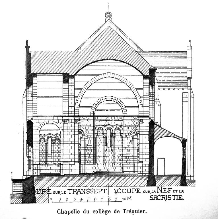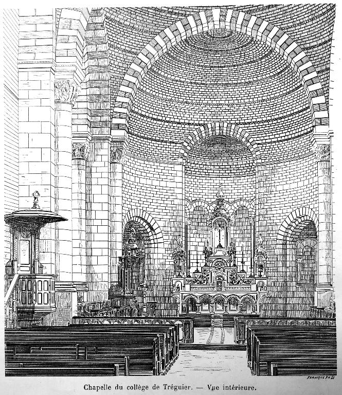 Ainsi que le fait voir le plan d’ensemble, une partie de ces bâtiments a été réédifiée sur un plan très simple. Tout d’abord, il ne s’agissait que de reconstruire la chapelle et d’ajouter une aile neuve au collège [au nord], en la soudant le mieux possible aux constructions anciennes, qui devaient être entièrement conservées. C’est dans ces conditions que fut étudié le projet de chapelle. Mais, comme il arrive trop souvent, on reconnut, en cours d’exécution, que le mauvais état des bâtiments, d’ailleurs peu commodes, exigeait leur reconstruction immédiate…