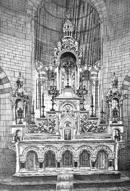 Cet autel, relativement très riche, est en pierre calcaire encadrant des mosaïques d’émaux à fonds d’or. La rosace l’éclaire bien en face ; les fenêtres des absides, peu nombreuses d’ailleurs, sont au contraire presque entièrement cachées au spectateur, toujours afin de laisser valoir l’autel et de donner au fond qu’il occupe plus de mystère.