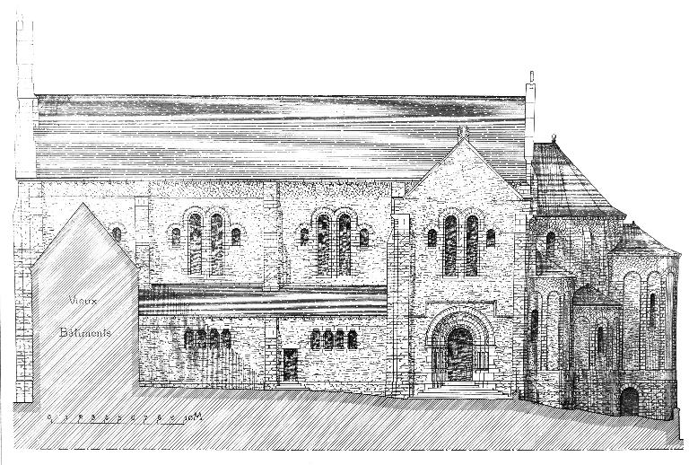 « …j’avais été frappé du bon aspect des rotondes absidiales de la chapelle, au-dessus du mur de soutènement des cours. […] …une façade latérale apparaissait, dessinée dans un si bon caractère, que je crus un instant à une restauration plutôt qu’à une construction neuve ; on devinait, dans le haut, au-delà des faitages des bâtiments accotés à la chapelle, une silhouette heureuse, couronnant un pignon. […]