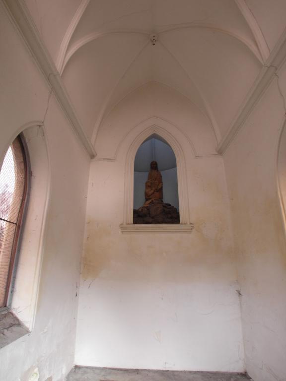 Le plafond est composé de fausses voûtes d'ogive marquées par des clés pendantes en leur centre. Une niche en arc brisé se trouve dans l'abside. Elle abrite une statue de Sainte-Anne.