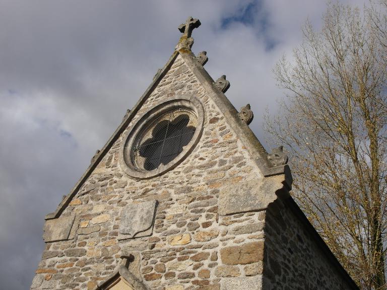 Sa façade principale est composée d'une porte en arc brisé soulignée par une moulure pleine, d'un blason, d'un oculus à huit lobes et d'un pignon découvert orné de crochets. On distingue deux croix, une en épis de faîtage et une autre sur un muret à gauche de l'ouverture. Les façades des bas côtés ont une ouverture avec un arc brisé. L'arrière est composé d'un chevet en abside. La couverture est en ardoise à pureau régulier sur le corps principal et elle est en écailles sur le chevet. Les chaînage sont en pierre de taille de granite.