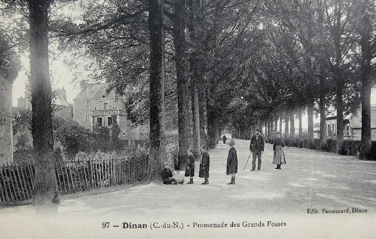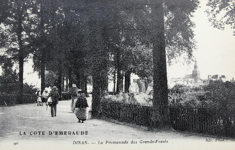 De nombreuses cartes postales du début du 20e siècle illustrent la manière dont les dinannais s'empare de cet espace. Lieu à la fois de déambulation, de causerie, de rassemblement ou encore terrain de jeu pour les enfants de la ville, la promenade est également un lieu de représentation. En effet, des villas de style "Belle-Epoque" se construite au tournant des 19e et 20e siècles, le long de la rue Leconte de Lisle qui longe la promenade des Grands Fossés.
