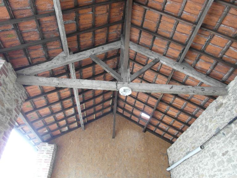 Dans le bâtiment Sud on peut observer une partie de la charpente avec une ferme assemblé en tenon-mortaise, des pannes et des contrefiches.