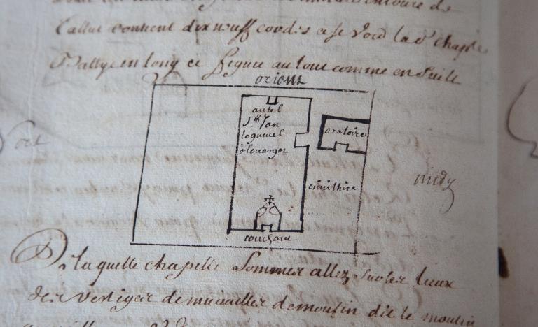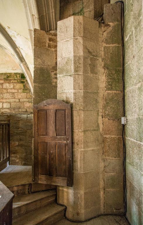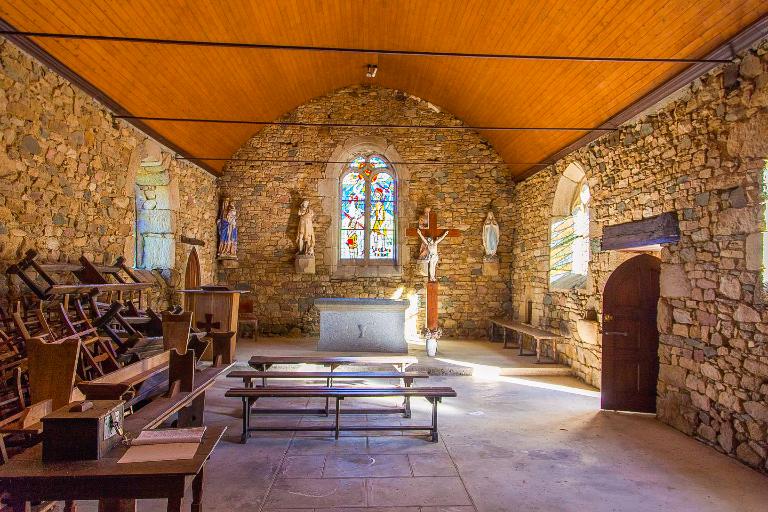 Quant à la chapelle Saint-Jean, là encore, les traces matérielles font presque défaut. C’est un modeste édifice de plan rectangulaire à nef unique flanquée d’une petite sacristie au nord. Les élévations principales accusent une restauration aux XVIIIes et XIXes siècles. Cependant, quelques éléments tardi-médiévaux ont été conservés, le remplage de la baie n°1, perçant le gouttereau sud de la nef, à deux lancettes trilobées surmontées d’un soufflet, une crédence en accolade, un bénitier réemployant un linteau monolithe et une console à l’écu effacé supportant une statue de Saint-Jean-Baptiste.