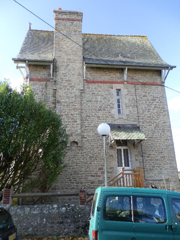 La façade principale présente une élévation ordonnancée faite de deux travées régulières avec un bow-window au rez-de-chaussée de l’avant corps, en bois avec une couverture en ardoise.Les murs en moellons de granite. baies sont en pierre de taille et les allèges de fenêtre remplies de brique. Un large bandeau de briques polychromes en façade antérieure souligne la séparation entre l'étage carré et l'étage de comble. La baie en plein cintre au sommet de l’avant corps, en granite, est surlignée d’un rang de briques.