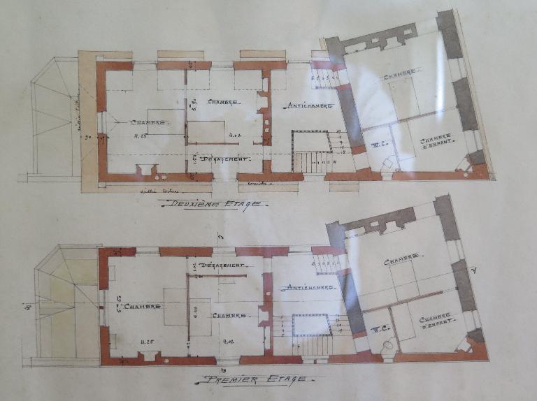 2. En retour contre la longère nord de la précédente, autre maison élevée sur caves avec perron donnant sur le jardin d’hiver au-rez-de-chaussée, chambres et cabinet de toilette à chacun des deux étages.