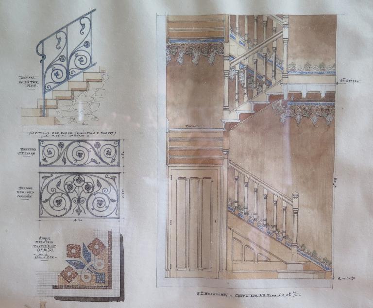 Rampes, garde-corps et balcons extérieurs en fer forgé sont de E. Robert.