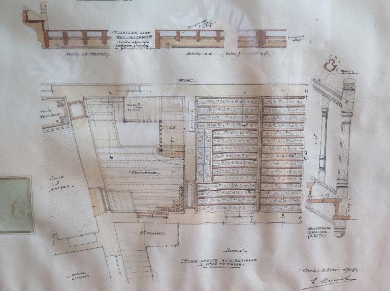 Les sols en mosaïque de tesselles de marbre (vestibule, petit vestibule et jardin d’hiver) ne sont pas attribués : il pourrait cependant s’agir du travail de l’atelier d’Isidore Odorico, mosaïste installé à Rennes à partir de 1882.