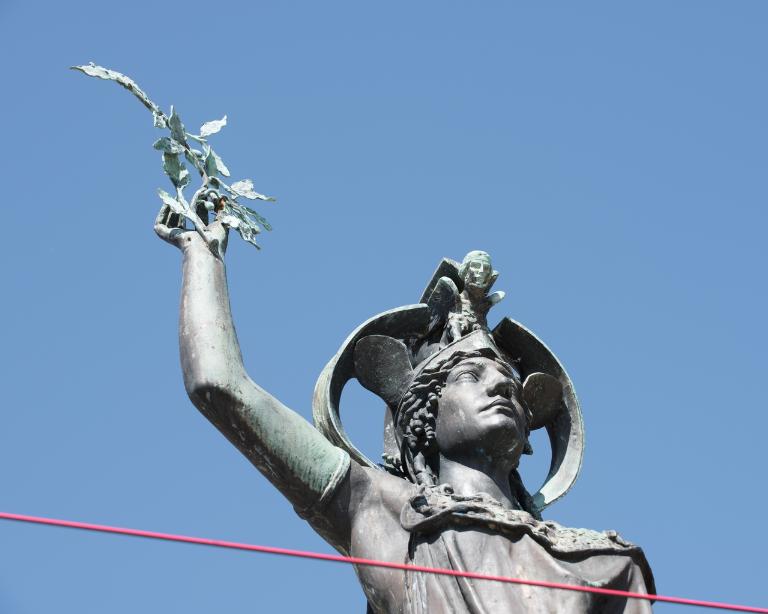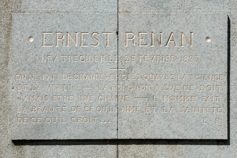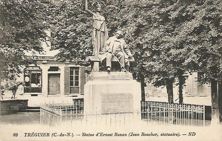 Le monument à la mémoire d’Ernest Renan a été inauguré le dimanche 13 septembre 1903 par le président du conseil Émile Combes dans des conditions très particulières : pour éviter l’affrontement entre anticléricaux et cléricaux, on fait appel à l’armée qui est obligée de charger baïonnette au canon contre les cléricaux (pour plus de détails sur l’inauguration du monument, nous vous renvoyons à la lecture du livre de Loïc Thomas intitulé Le Bronze de Renan à Tréguier, 1903).