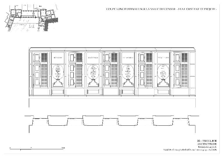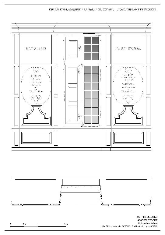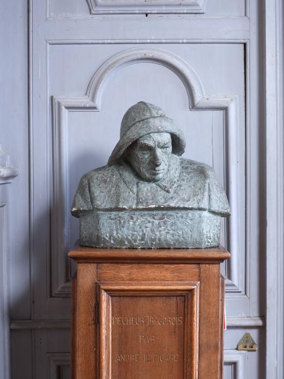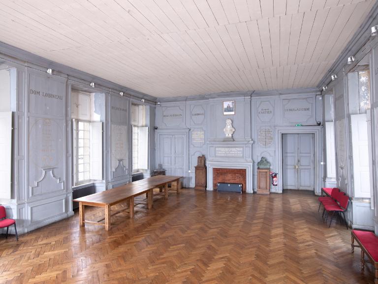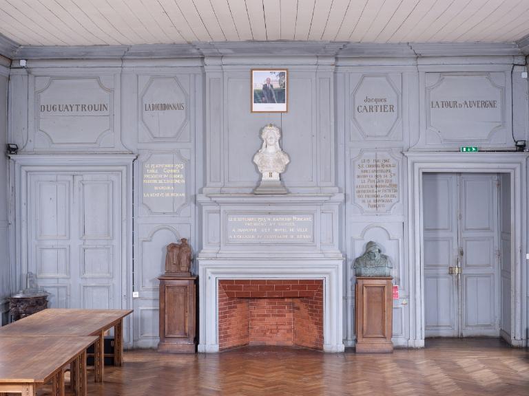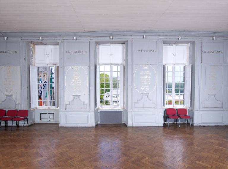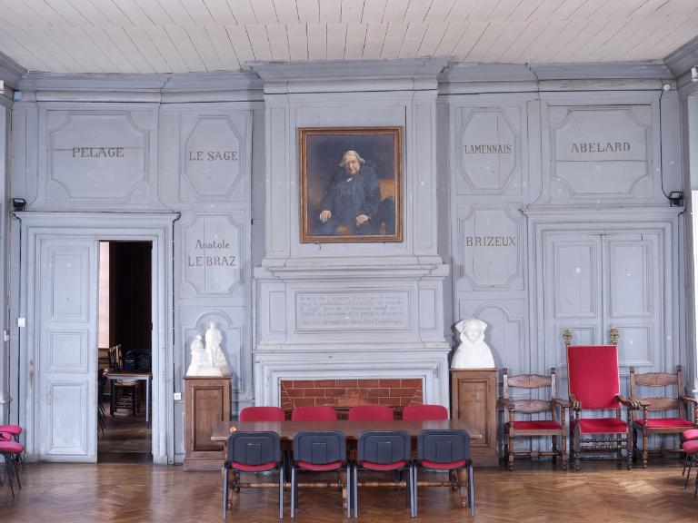 Le décor en grisaille façon 19e siècle était toujours d’actualité en cette période de début de siècle. L’intérêt du décor de cette grande salle de réception demeure dans les valeurs et la fierté d’un après guerre. La reconnaissance de Tréguier aux enfants de Bretagne devenus de prestigieux personnages historiques est ici louée en les immortalisant nommément sur les boiseries. Ils sont inscrits sur les boiseries à la bronzine et non à l’or :
