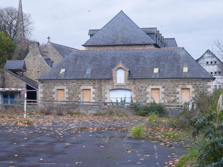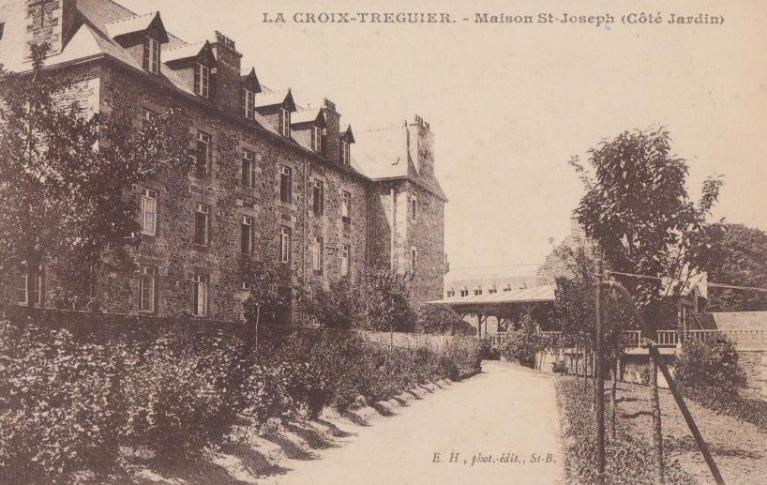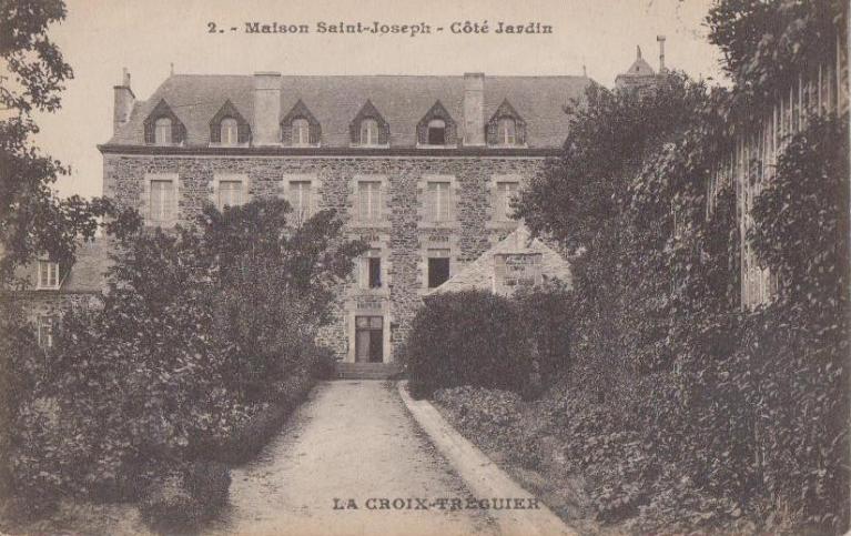 Pour recevoir les nombreuses personnes qui viennent faire des retraites au couvent des Filles de la Croix, la maison Saint-Joseph est construite entre 1864 et 1865, à l'extérieur de la clôture du couvent, dans la petite cour dite de Rome. Monsieur Le Goff, aumônier de la communauté, réalise les plans de l'édifice et préside à son exécution. Les matériaux proviennent d'une carrière de moellons située à deux kilomètres (Langazou), propriété des demoiselles Trogoff, mise à la disposition du couvent. Réalisée avec de petites pierres et du mortier d'argile, la maçonnerie est très vite défectueuse et dès les premières années, des fissures apparaissent dans les murs nécessitant en 1875 de grosses réparations (démolition en partie du pignon sud qui menace de s'effondrer). Très vite, les réfectoires ne servant que dans les deux à trois semaines de retraites annuelles, deux d'entre eux sont convertis en chambres pour les dames pensionnaires ainsi que les dortoirs des étages.
