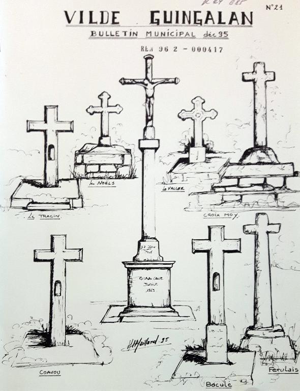 Croix de chemin (La Croix Moy) : cette ancienne croix de carrefour est entièrement réalisée en pierre de taille de granite et date du milieu XIXe siècle (1855). Elle surmonte un socle à angles abattus, posé sur une importante base pyramidale de plan carré à trois degrés, réalisée en pierres de taille et ciment. Le fût de la croix est fiché dans une pierre polygonale aux bords arrondis. Le revers de la traverse de la croix comporte une inscription : “F:P:M:J:FLEURIL:J:1855” (Fait par M. J. FLEURIL). Elle remplacerait une croix érigée au XVe siècle, à la frontière des trois paroisses de Vildé-Guingalan, de Trélivan et d’Aucaleuc. Elle est située à l’emplacement présumé de l’ancienne voie romaine reliant Corseul à Rieux.