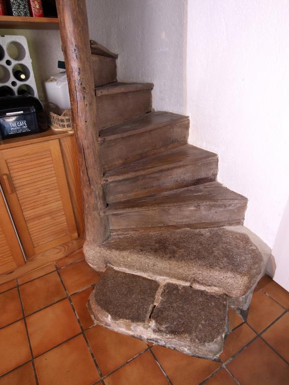 À l’intérieur, on retrouve une seconde ouverture en plein-cintre similaire à celle de la façade et placée dans l'alignement de cette dernière. Elle permet d’accéder à la pièce située dans l’avancée, depuis la pièce de vie. Dans la pièce principale, le mur ouest comporte une cheminée monumentale au manteau de granite. Elle est accompagnée d’une niche à sel, placée à sa droite. Un remarquable escalier à vis en bois est toujours présent dans l’avancée de cette partie du bâtiment. Il permet d’accéder à l’étage, où l'on trouve encore une niche destinée au rangement du linge et une petite cheminée en pierre de taille. L'escalier permet également d'accéder aux combles.
