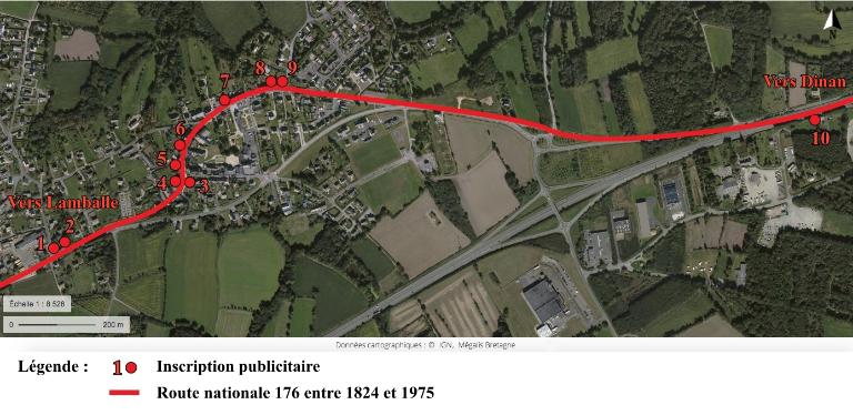 L’ancien passage de la RN 176 (avant 1975) a laissé des traces dans le centre-bourg. En cheminant le long de la route, il est encore possible de distinguer 10 inscriptions publicitaires peintes (plus ou moins bien conservées) sur les murs pignons des maisons de bourg. Ces peintures des années 1950-1960 témoignent de l’histoire de Vildé-Guingalan comme d’un lieu de passage important. La liste ci-dessous les resitue d’Ouest en Est.