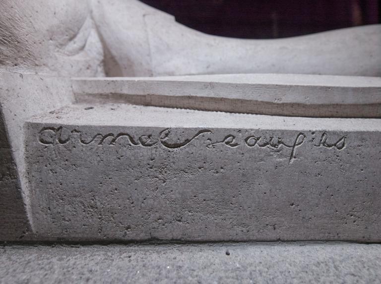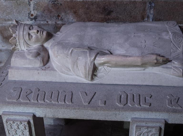Selon Loïc Thomas, la réalisation du nouveau tombeau de Jean V dans la cathédrale Saint-Tugdual a été proposée par Gustave de Kerguézec qui recevant le 19 mai 1937 diverses délégations à la mairie de Tréguier annonce un plan de travaux à réaliser à la cathédrale. Une souscription est lancée durant l'été 1942 pour la réalisation d'un projet par le sculpteur Armel Beaufils. Le tombeau et le gisant du duc Jean V de Bretagne ont finalement été réalisés et installés dans la chapelle du Duc en septembre 1945 (1947 ?). Les pieds de la table en granite sont ornés d’armoiries : duché de Bretagne, ville de Tréguier. On peut y lire les inscriptions suivantes : "Vannes. 1389" ; "Jehan V. duc de Bretagne" ; "Nantes. 1442" ; "Iann Pempvet duk a breiz" (en breton).