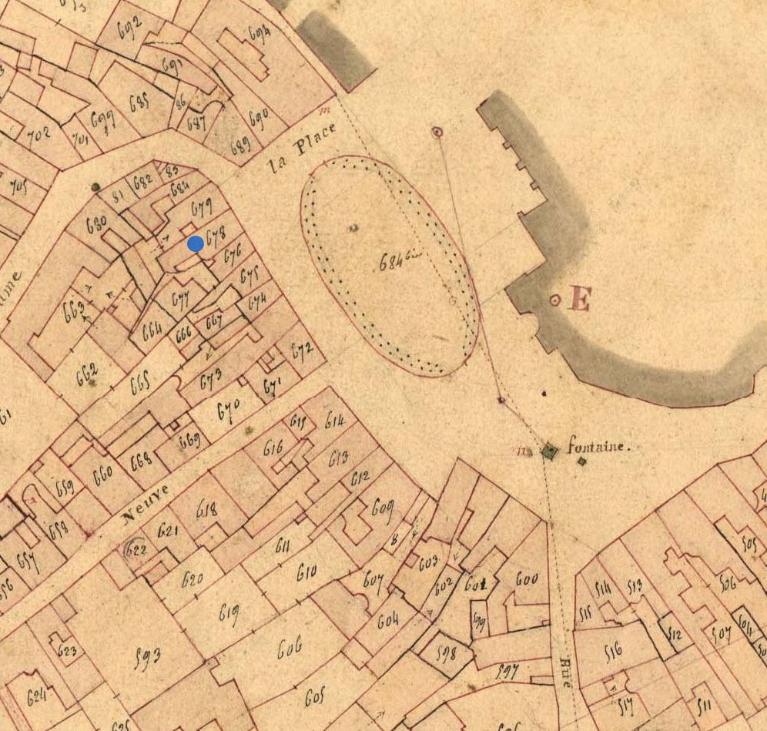 Maison à boutique au rez-de-chaussée, deux étages, comble à surcroît et sous-sol. Le plan s'adapte à l'étroitesse de la parcelle, il présente une pièce unique par niveau desservie par un escalier en vis en demi hors oeuvre situé à l'arrière. Sous l'escalier une porte permet de descendre au sous-sol, une autre de communiquer avec la petite cour enclavée. Autrefois, un couloir latéral pris dans le volume du rez-de-chaussée permettait d'accéder à l'escalier et aux étages directement depuis la place, sans passer par la boutique.
