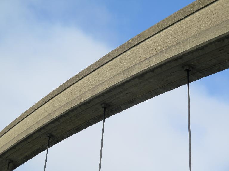 Pont en arc d’une portée de 153 mètres avec tablier inférieur réalisé en béton armé (3200 mètres cubes) doté de 36 suspentes en acier (chaque suspente étant constituée de 40 fils métalliques de 7 mm disposés pour former une section rectangulaire). Le tablier faisant travée principale est constitué d'une dalle reposant sur une grille de poutres : la route d’une largeur de 7 mètres est doublée de trottoir. Sa longueur totale avoisine les 180 mètres de longueur.