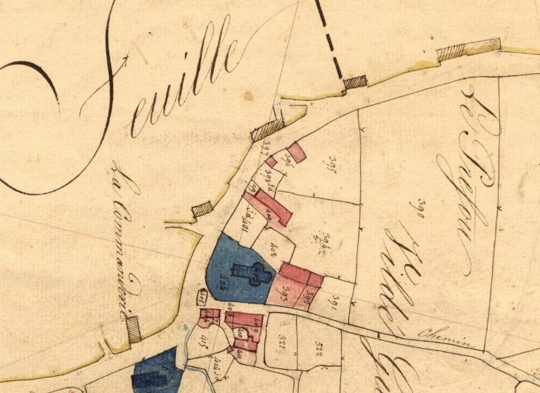 Reconstruite au début du 17e siècle, cette maison semble prendre place sur des fondations plus anciennes, au vue des différences de maçonnerie du mur nord. Sa façade sud semble présenter les armoiries de la famille de Guitté "d'azur à la croix d'argent", sculptées sur le linteau de la fenêtre de droite. De par sa position, son traitement soigné et la présence de ce blason sculpté, cette maison pourrait avoir été la demeure d'un procureur fiscal au service de la famille.