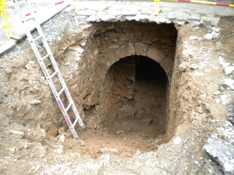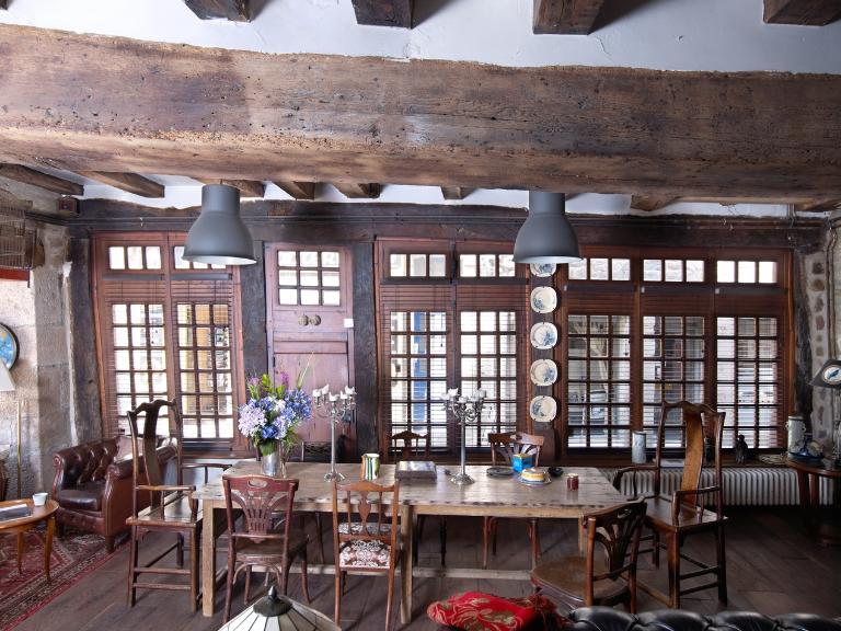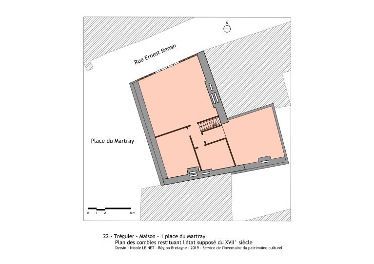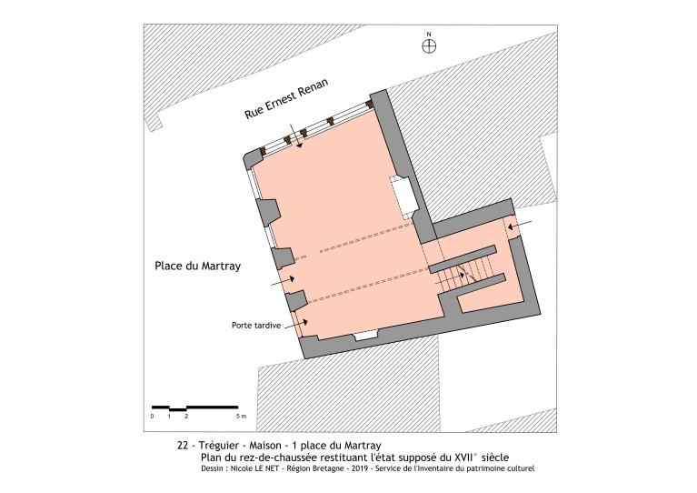 Cette grande maison de la fin du 15e ou du début du 16e siècle, édifiée à l'angle de la place du Martray et de la Grande rue (actuelle rue Renan) bénéficie d'une situation avantageuse. Elle associe activité commerciale au rez-de-chaussée et logements aux étages. Sa proximité immédiate avec la cathédrale et le cloître, le confort de ses deux logements, suggèrent une occupation possible par des chanoines. Le sous-sol voûté était accessible depuis la place du Martray, par une large porte cintrée aujourd'hui bouchée, située à l'angle sud-ouest de la façade. On y accédait par un escalier de façade disparu, comblé par des remblais. La cave voûtée en berceau, renforcée par des arcs-doubleaux, semble antérieure au 15e siècle, peut-être construite au 13e siècle, ce qui en ferait l'un des édifices les plus anciens de la ville. Aujourd'hui, le remblai accumulé dans la cave a exhaussé le sol jusqu'au niveau des soupiraux, aménageant une hauteur sous voûte utilisable de un mètre à peine.