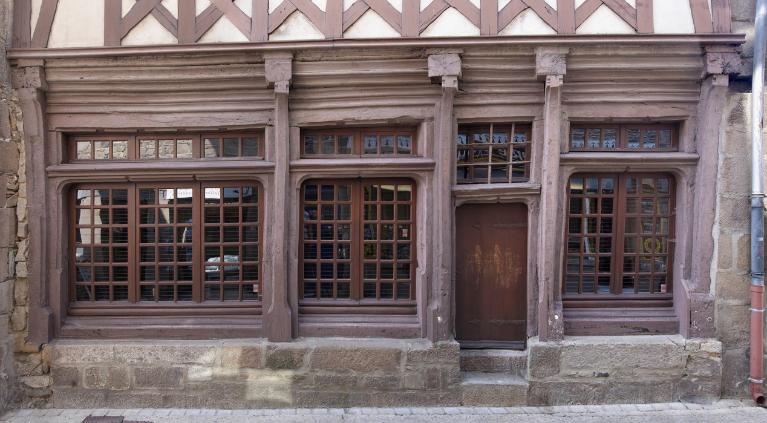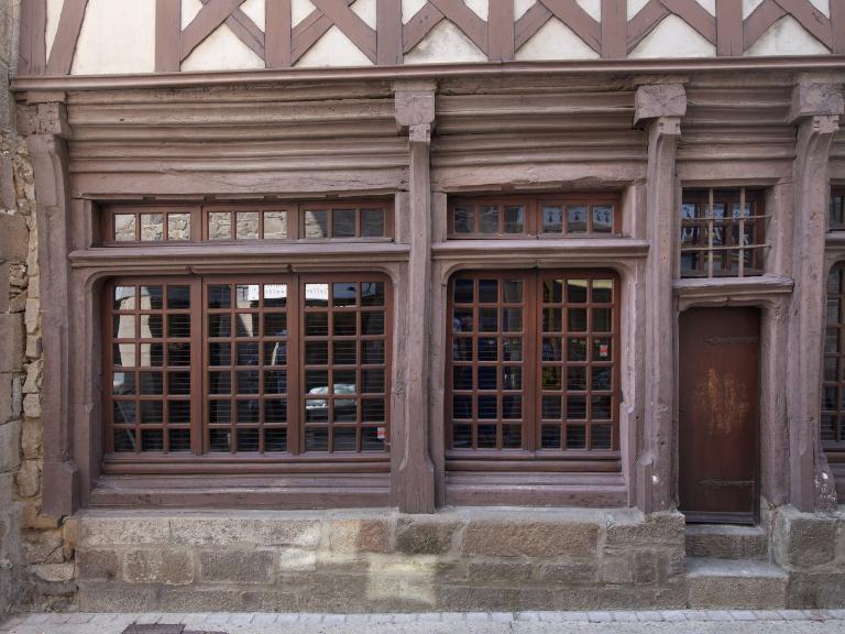 Maison d'angle de plan allongé, à deux étages et deux pièces par niveau, chacune dotée d'une cheminée sur pignon ou sur mur gouttereau. La façade sur la place est construite en moellon de granite et de schiste tandis que le large pignon nord sur rue est en pan de bois. Il présente deux légers encorbellements sur solives, supportés par les cinq poteaux du rez-de-chaussée. Ces derniers sont renforcés sur toute leur hauteur par des consoles qui s'incurvent vers le haut. Ils reposent sur un mur bahut qui supportait l'étal de la boutique. Aux étages du pignon, des petites fenêtres, en partie bouchées aujourd'hui, sont disposées en bandeaux continus. Celles du premier étage sont placées entre deux niveaux de croix de saint André, selon le procédé de l'atelier de Guingamp. Une grande fenêtre a ensuite été percée dans le pan de bois entre les petites fenêtres bouchées.