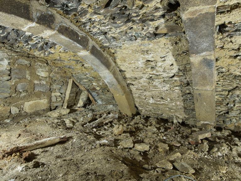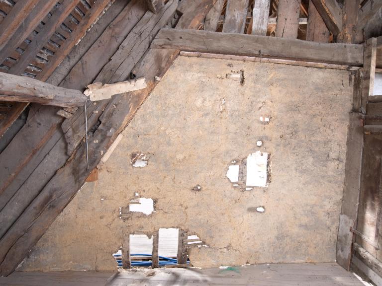 La cloison du rez-de-chaussée, aujourd'hui disparue, formait séparation entre un espace dédié au commerce et un espace privé à usage domestique, comme en témoigne la cheminée incorporée dans le pignon sud. Cette partition explique l'existence des deux accès, l'un à l'ouest pour la partie privative, l'autre dans le pignon nord pour la boutique. L'ensemble est édifié sur un niveau de sous-sol voûté en berceau, renforcé par trois arcs-doubleaux. Cette cave avait un accès direct depuis la place du Martray (aujourd'hui remblayé), grâce à un escalier (aujourd'hui disparu) situé dans l'angle sud-ouest de la façade. Deux trappes sont ménagées dans le plafond, l'une derrière l'entrée ouest, l'autre au milieu de la boutique, pour permettre d'accéder directement au premier niveau de la maison. Dans le mur nord, une porte bouchée indique l'existence d'une communication avec une possible cave mitoyenne. Le comble abrite un espace de stockage sous charpente stabilisé par un système de contreventement à croix de saint André.