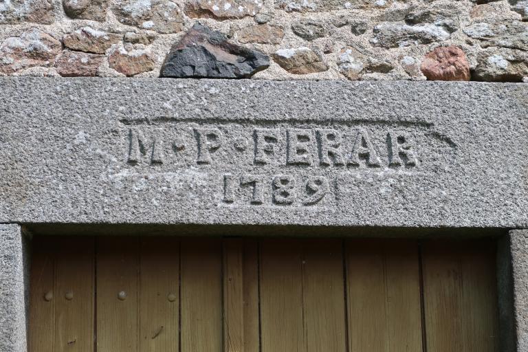Ce logis reprend une organisation type, à deux pièces au sol, des maisons et fermes de l’Ancien Régime de ce territoire. A savoir, une salle chauffée avec accès direct sur la cour qui communique avec une autre pièce sans cheminée. Celle-ci peut prendre plusieurs usages, cellier ou étable. A l’étage, au-dessus du cellier, une chambre chauffée ayant une fenêtre sur la cour et une autre, à l’arrière, sur la campagne. Elle est mitoyenne d’un grenier. Le tout étant surmonté d’un deuxième niveau de grenier. Hormis la gerbière qui est en bois, les autres ouvertures sont en pierre de taille de granite, tandis que le gros œuvre est en moellons. L’inscription traduit à la fois l’instruction et la fierté de son occupant, lors de son installation dans la maison.