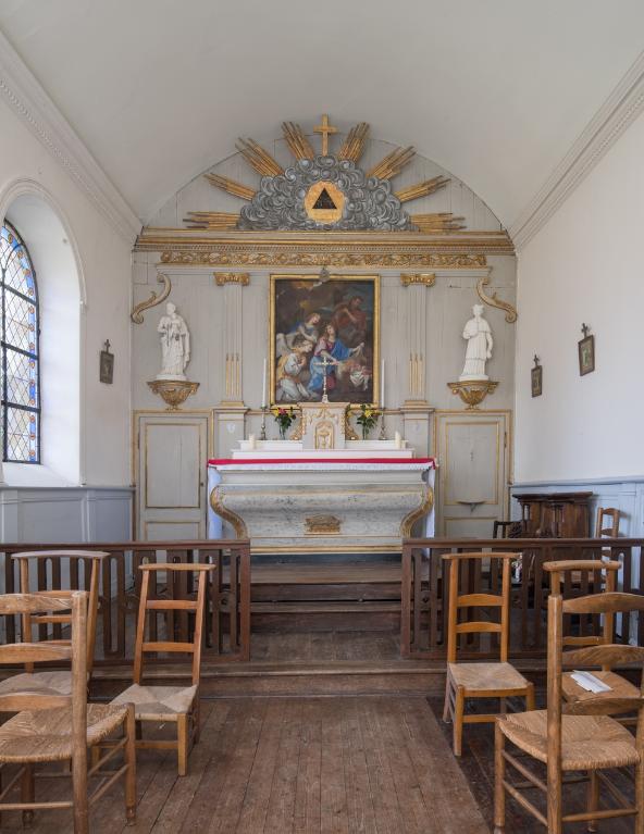 La Chapelle, de plan rectangulaire régulier, possède un petit campanile en façade fait de charpente et d’essentage d’ardoises. La couverture de ce campanile est particulièrement soignée avec son décor d’ardoises en écailles et une croix en ferronnerie repercée.