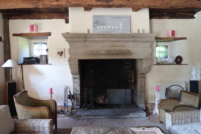 Une partie de l’histoire de cette maison se cache dans une inscription sculptée sur un linteau de porte. En effet, l’ancien linteau de la porte de la maison a été réemployé à la porte du jardin. L’inscription qui est sculptée, sur une pierre de taille de granite, mentionne les premiers commanditaires : Guillaume Adam et sa compagne G(iIlette) Garnier qui s’installent en ce lieu en 1645 (date portée). Guillaume Garnier fait partie des procureurs fiscaux de la seigneurie de Coëtquen, il décède en 1652. De cette période subsiste le logis principal qui se détache des autres bâtiments par son large pignon découvert, son étage habitable plus élevé. La salle, en rez-de-chaussée conserve une grande cheminée en pierre de taille de granite dont le manteau et la tablette fortement moulurés indiquent le milieu du 17e siècle. Le logis a cependant été réaménagé et repris dans ses ouvertures aux périodes précédentes.