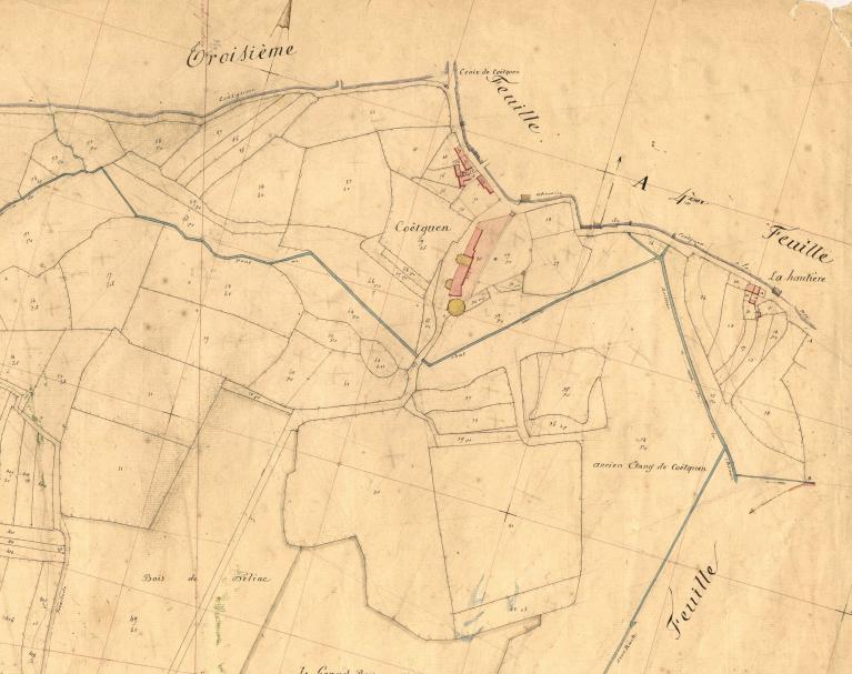 Les guerres de la ligue qui opposent les catholiques et les protestants (1589-1598) ont été particulièrement sanglantes sur ce territoire. Le château et le village de Coëtquen sont assiégés. Quelques maisons conservent des éléments du 16e siècle, pour beaucoup d’entre elles en réemploi. Quelques dates et inscriptions rendent compte de reconstruction dans la deuxième moitié du 18e siècle, 1777, 1779. A cette période, Nicolas Lorre (1706-1791), notaire de la juridiction de Coëtquen était propriétaire de quelques maisons. Les matrices cadastrales en 1844 mentionnent toujours plusieurs familles de descendants.