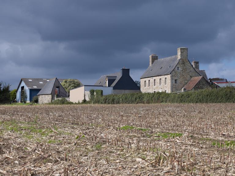 - la protection contre les vents dominants d’ouest (pluvieux) et du nord (froids) grâce au relief. Souvent implantés à mi-pente, les bâtiments d’habitation tournent ainsi le dos au vent ; les fenêtres sont uniquement percées dans la façade sud. Autour des hameaux, le bocage permet d’atténuer l’effet du vent. Dans le Trégor, les logis de ferme sont le plus souvent orientés vers le sud-sud-est ou le sud-est.