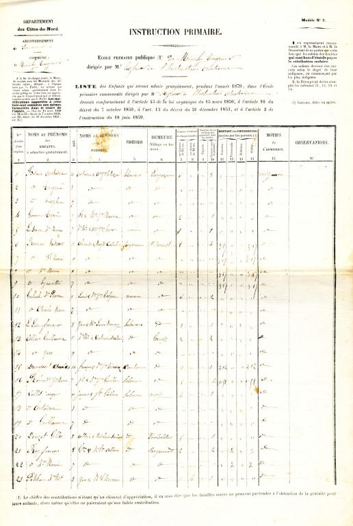 En 1864, l’inspecteur d’académie des Côtes-du-Nord signale au préfet l’absence d’école primaire à Minihy-Tréguier (alors que la commune compte 1575 habitants). Le Fichant, maire de Minihy-Tréguier jugeait encore en 1870 qu’il serait "infructueux" de créer une école "aux portes même de Tréguier" et proposait de placer les deux tiers des "élèves indigents1" à l’école des Frères de la doctrine chrétienne à Tréguier (Frères de Lamennais) et l’autre tiers à celle de Langoat avec l’instituteur. Le conseil municipal est "persuadé que par ce moyen, on arrivera facilement et surtout commodément à procurer l’instruction gratuite à tous les enfants indigents de la commune"2. Trente-huit enfants – uniquement des garçons3 - sont admis gratuitement à l’école primaire de Minihy-Tréguier dirigée par les Frères de l’Instruction chrétienne selon la liste établie pour l’année 18794.