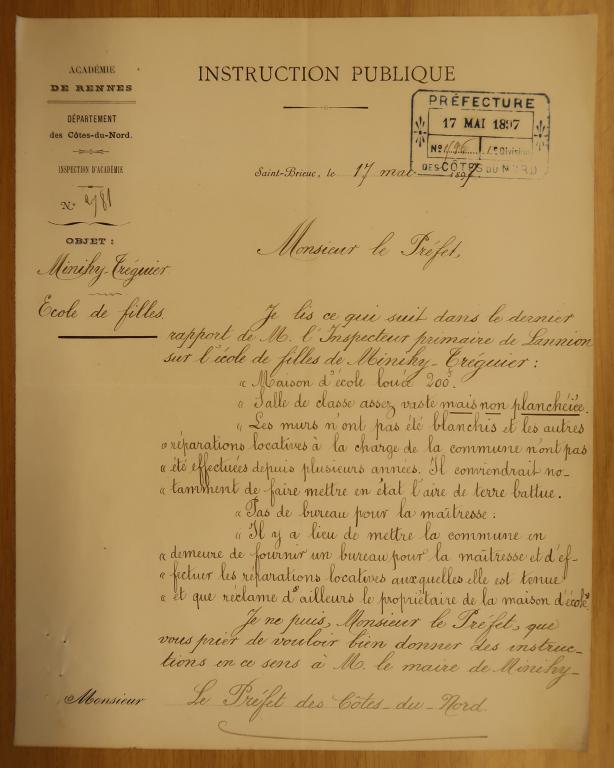 En septembre 1893, mademoiselle Le Berre, institutrice à Minihy-Tréguier décrivait l’école mixte de Minihy-Tréguier à l’inspecteur d’académie comme un "local loué pour 200 francs", "une classe obscure, humide, sur sol en terre battue, très incommodante, longue, étroite. Au-dessus se trouve mon habitation composée d’une petite cuisine et d’une chambre à coucher mal aérée et sans cheminée. […] Au dehors, j’ai dû, à mes frais, faire installer des cabinets pour les garçons et pour les filles, faire arranger et sabler la cour, clôturer le jardin, etc.7". La situation demeure inchangée jusqu’en 1897 au moins, au point que le sous-préfet écrit à son supérieur pour lui demander de mettre en demeure la commune de "fournir un bureau pour la maitresse et d’effectuer les réparations locatives auxquelles elle est tenue et que réclame d’ailleurs le propriétaire de la maison d’école8".