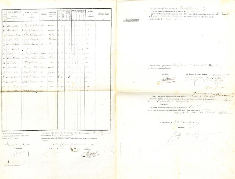 En octobre 1880, il n’y a toujours pas d’école pour les filles à Minihy-Tréguier en dépit de la loi du 10 avril 18675 rappelée par l’inspecteur d’académie au maire. L’argument avancé par le conseil municipal réuni sous la présidence de monsieur de Roquefeuil, maire, est : "que la commune de Minihy est formée de plusieurs villages éloignés du centre communal dont les enfants fréquentent les écoles de Langoat et de Tréguier et ne se rendraient pas, à cause de la distance, à l’école qui serait établie au bourg ; que le bourg est très peu important comme agglomération et qu’il est impossible d’y trouver une maison présentant les conditions requises pour l’installation d’une école". De son côté, le sous–préfet "serait d’avis de créer, au lieu d’une école municipale, plusieurs écoles de hameau dans les villages les plus peuplés qui composent la commune"6. En novembre 1880, il est proposé que mademoiselle Martin, "institutrice libre" devienne "institutrice communale". Il est également proposé que l’école libre de Lann-Gazou [Langazou] puisse être érigée en "école publique".