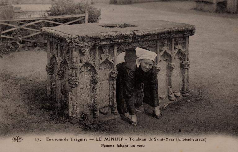 Le récit du curé de la cathédrale de Tréguier au début du 19e siècle qui relate le déroulement de la fête de saint Yves, rapporté par Georges Provost dans son article consacré au rituel du pardon publié dans l’ouvrage collectif consacré au saint en 2004 confirme l’existence et l’usage affecté tout spécialement à cette occasion à l’oratoire du cimetière de Minihy-Tréguier. En revanche et curieusement le récit du prêtre ne mentionne pas le rituel du passage sous le tombeau...