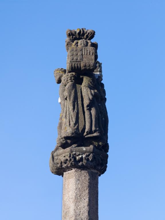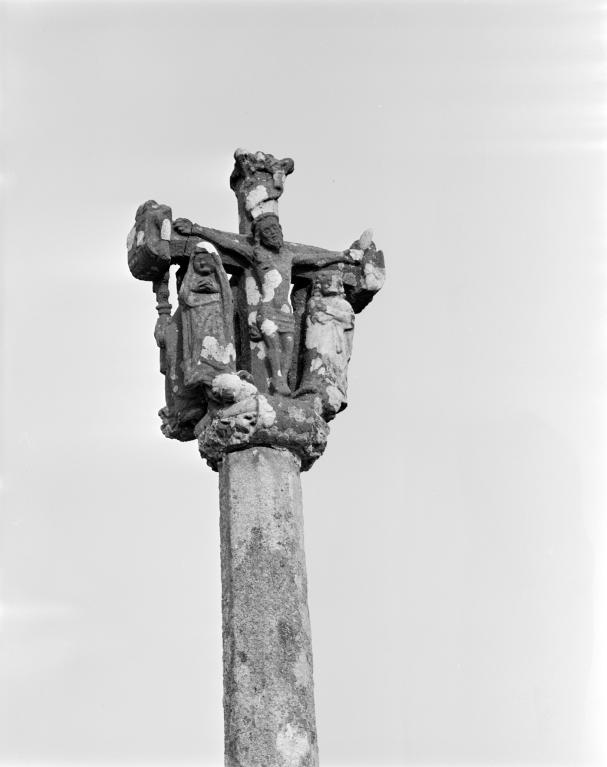 Calvaire érigé dans l’espace sacré du cimetière. Vers l’ouest-sud-ouest, Christ en croix surmonté du titulus, entouré de la Vierge à sa droite et de Saint-Jean à sa gauche, les bras en croix ; les personnages sont supportés par des angelots. Au pied du Christ, des armoiries. Au revers, Vierge à l’enfant au centre, encadrée de deux personnages : une femme (probablement Marie Madeleine) et un saint évêque. Le calvaire porte les armes de la famille de Roquefeuil et de ses alliés. Selon Jean-Jacques Rioult, c’est à Jean Larchantec [Leuchantec] – également auteur du maitre-autel de l’église en kersanton daté 1872 - qu’il faut attribuer cette croix.