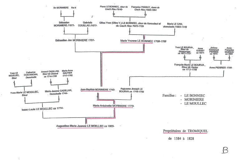 Le 17-20/03/1750, après le décès de Marie LE CAN épouse LE BONNIEC en Novembre 1749, il y eut partage des biens. Marie-Yvonne LE BONNIEC épouse MORINIERE a hérité de TROMIQUEL et des terres appartenant au manoir en particulier les terres de "Parc Prat Amour".
