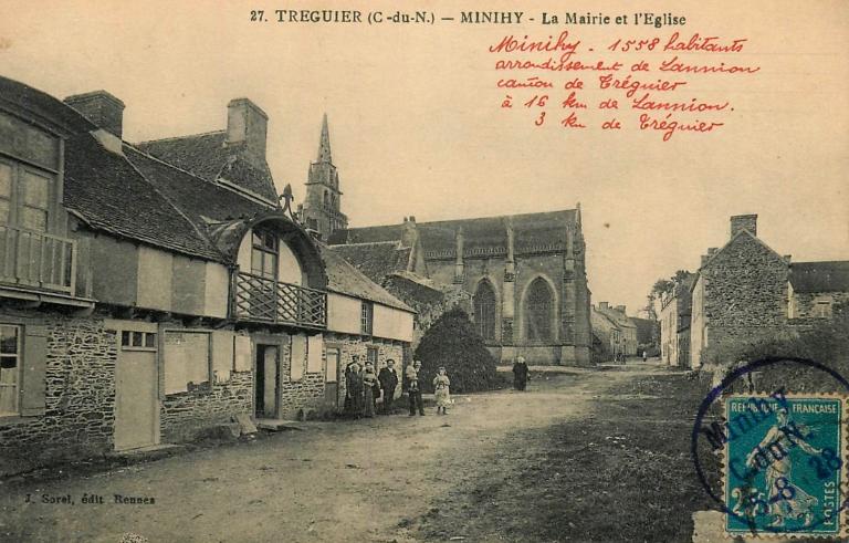 Il faut attendre le 2e quart du 19e siècle et les décennies suivantes pour voir le développement (très léger) du bourg de Minihy-Tréguier avec la construction de nouveaux logis dédiés aux activités commerciales (ce phénomène se poursuit jusqu’à la veille de la Première guerre mondiale). C’est le cas du logis à cinq travées qui accueille l’actuelle mairie, qui selon toute vraisemblance a abrité un commerce. A noter que la population maximum est obtenue en 1846 avec 1607 habitants9. C’est à la même période - 1819 et 1824 - que l’église paroissiale est agrandie d’une travée et que la façade ouest et le clocher sont reconstruits. En 1853, elle est dotée d’une nouvelle sacristie.