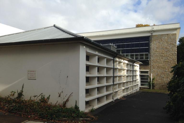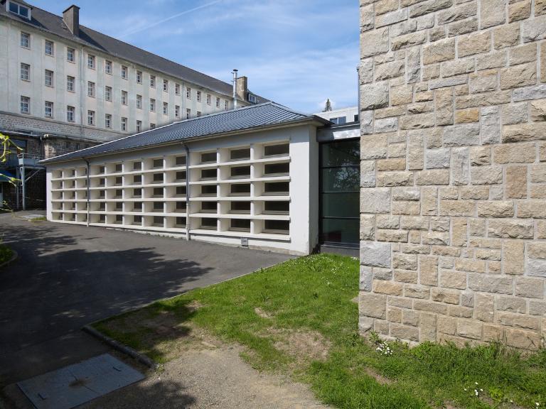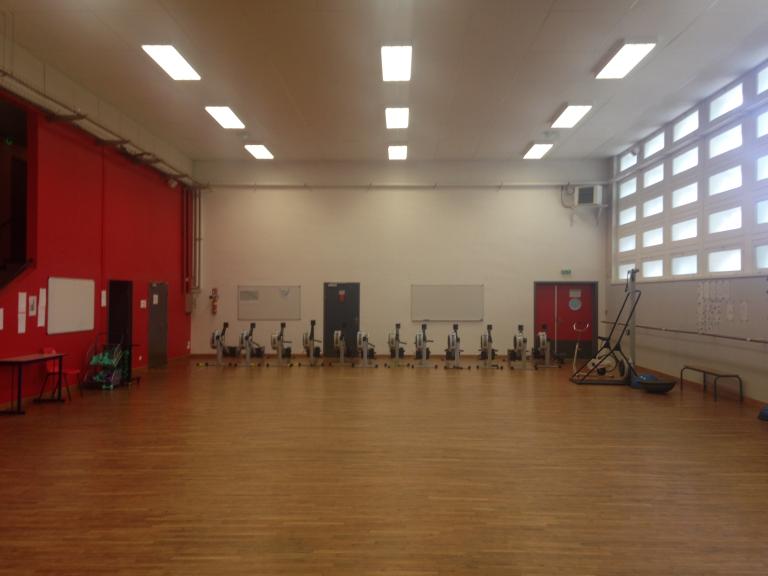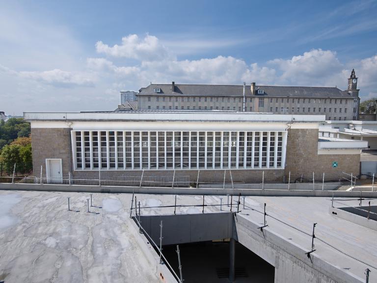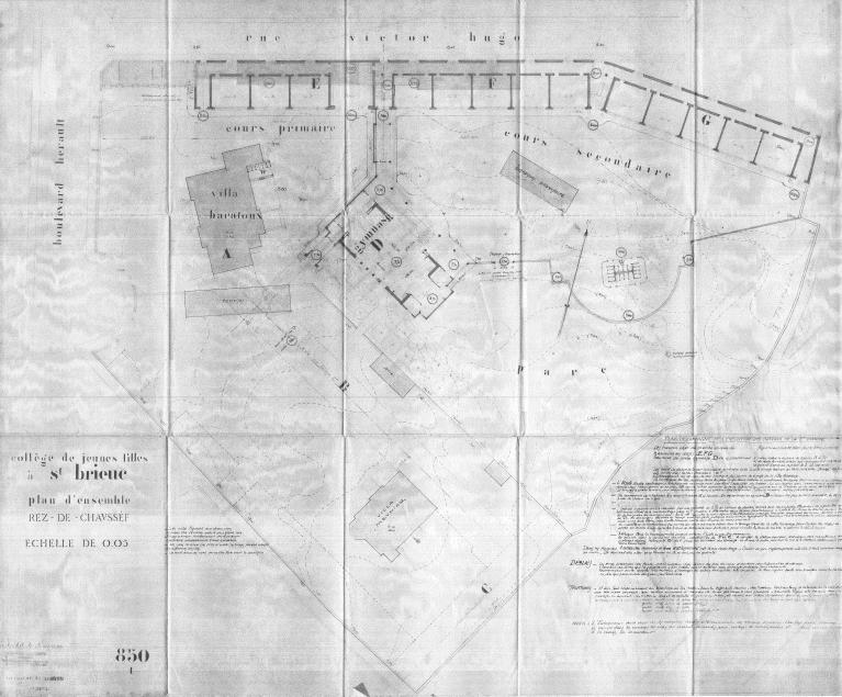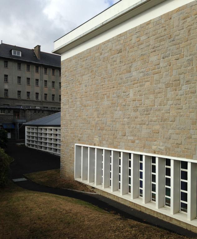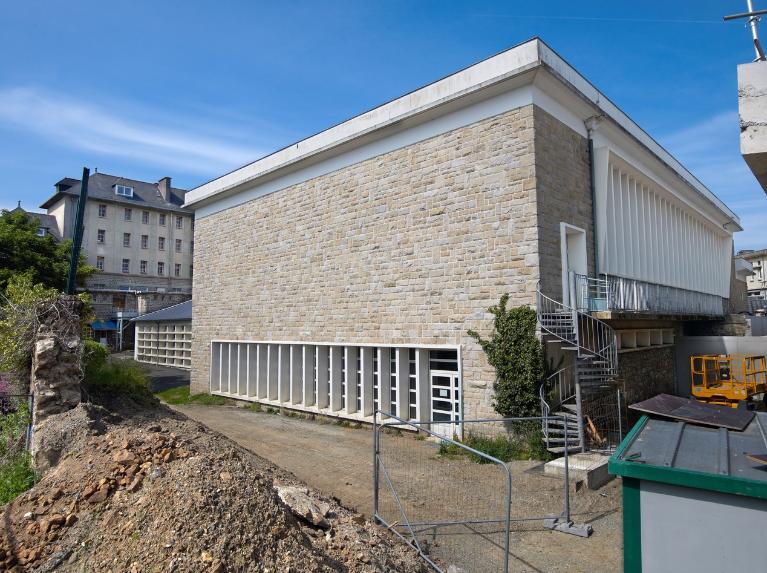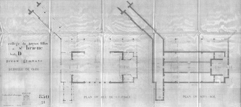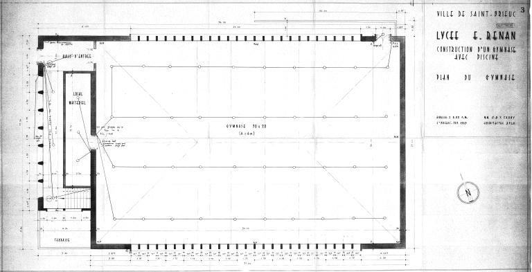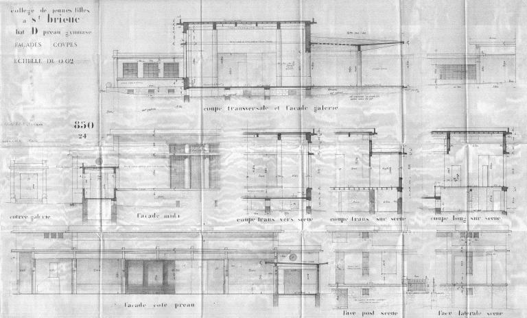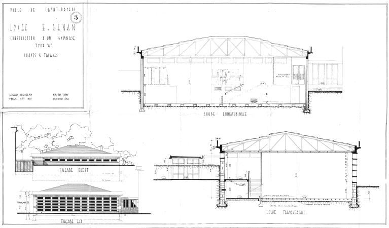 Parmi les nouveaux bâtiments du lycée de jeunes filles de Saint-Brieuc, conçus par G.-R. Lefort et inaugurés le 29 mai 1938, figurait un préau gymnase. Au début des années 1960, l'équipement est devenu insuffisant pour une population scolaire qui atteint 1400 élèves. Le programme pédagogique transmis par le ministère de l’Éducation nationale à la ville le 7 avril 1962 prévoit donc la construction d’un gymnase de type B incluant un bassin-école dans son niveau bas. Le projet élaboré par J. et Y. Fauny fait l'objet d'un arrêté d'approbation technique le 2 novembre 1962 et d'une subvention de 442 288,63 F. Le chantier s'ouvre en octobre 1963 et la réception provisoire est prononcée le 18 février 1965. Presque aussitôt, on décide de le compléter par un second gymnase, de type A, placé à l'équerre du précédent. Œuvre des mêmes architectes, il bénéficie de l'approbation technique les 22 mars 1965 et 5 décembre 1966 et d'une subvention totale de 156 000 F au taux de 65% (arrêtés des 21 juillet 1965 et 5 décembre 1966). Le procès-verbal de réception définitive est signé le 2 avril 1969. Quarante ans plus tard, les installations sportives du lycée sont restructurées par l'atelier d'architecture Hargos : le premier gymnase de Lefort est transformé en amphithéâtre, sans modification importante de façade, tandis que ceux des Fauny sont modifiés par la création d’un hall de jonction entre grand et petit gymnases avec mise en place d’un ascenseur et d’une allée assurant l’accessibilité aux PMR, transformation de l’ancienne piscine en salle d’activités physiques, édification d’une contre-façade en vitrage photovoltaïque au grand gymnase. Le permis de construire est délivré le 20 mars 2008 et les travaux débutent le 9 juillet.