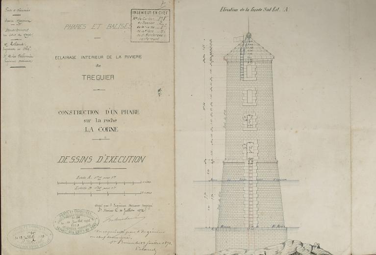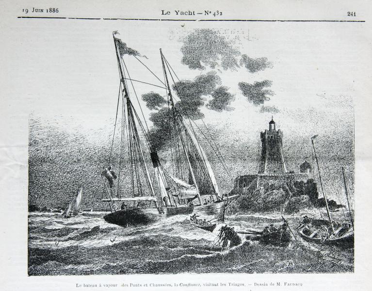 En 1883, le receveur des douanes Louis-Marie Faudacq est affecté au port de Tréguier jusque sa retraite en 1900. C’est à ce titre qu’il demandera un meilleur balisage de la rivière de Tréguier (cotre baliseur La Confiance à quai), s’intéressera aux amendements marins, goémons d’épave arrachés aux îles d’Er à l’embouchure de la rivière et gisements de sable et de maërl au Banc du Taureau en amont du phare de la Corne (photo fonds Faudacq bateau sablier). Le balisage de la rivière de Tréguier en 1886 était assuré par un petit sloop de 1, 8 t, Il servait à la remise en place des balises et à la peinture des tourelles, secondé par le canot creux « Auguste-Marie », construit en 1859 pour le roulement des gardiens et l’approvisionnement du phare de la Corne, allumé en 1876. Il faudra attendre 1906 pour qu’un grand vapeur neuf « Léonord Fresnel » prenne la relève pour l’ensemble du balisage des Côtes du Nord.