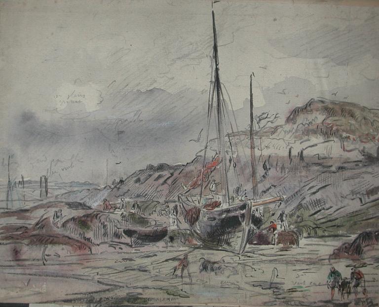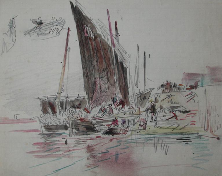 C’est davantage la vie grouillante des quais et des estrans qui séduit la riche palette de l’artiste, les scènes portuaires qu’il croque sur le vif, sur le motif, en utilisant ce que le douanier en exercice a sous la main : feuille de papier quadrillé, imprimé des douanes, morceau de carton, où il va rapidement esquissé et mettre en couleur telle manœuvre sous voiles, le halage d’une lourde embarcation, le déchargement d’une galéasse avec son mât de charge, les échouages dans la glaise bleue des grèves, les postures, les attitudes des marins…