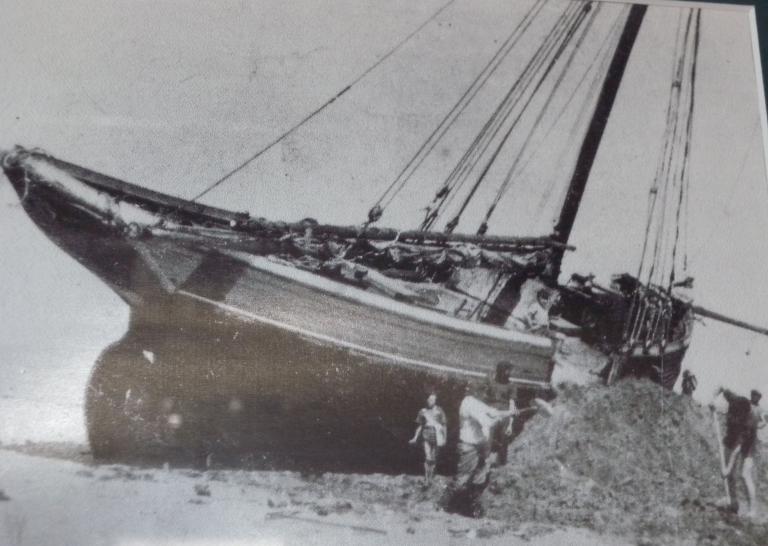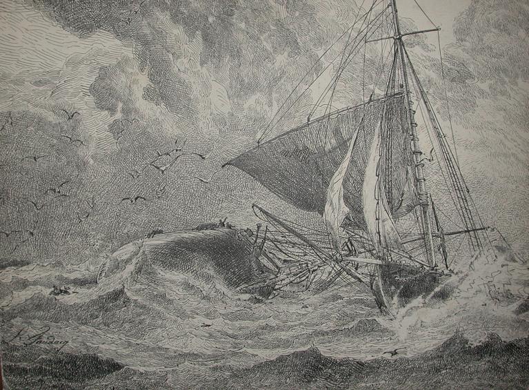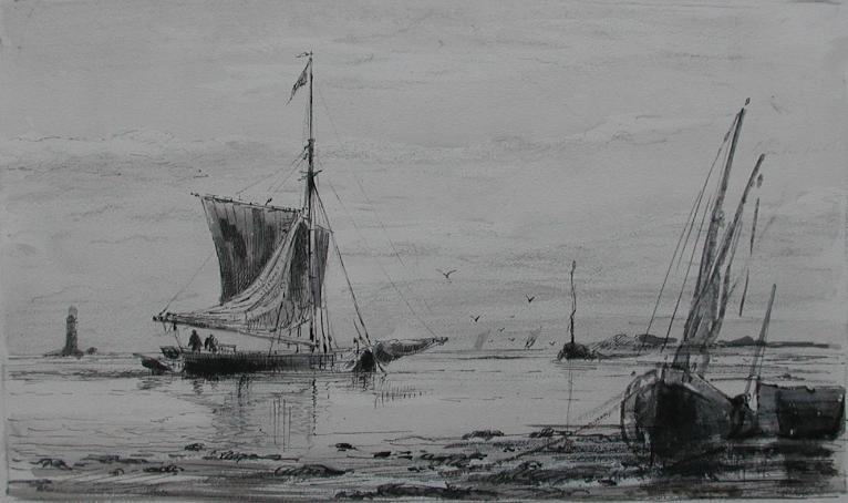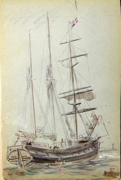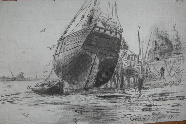 Cette figure de voilier de travail, fréquentant l’estuaire du Jaudy, représente un type ancien et caractéristique des chaloupes creuses à voile au tiers et cul pointu. Il s’agit d’embarcations de 6 à 7 tonneaux, non pontées, avec un tillac à l’avant et plusieurs bancs de nage, pour équipage nombreux. L’homme de barre semble confortablement accroupi sur le tollen arrière, tenant la barre du gouvernail extérieur ; l’écoute de l’unique de la grande misaine est bordée dans l’axe du bateau, à portée de main du barreur. L’ensemble est remarquablement stable et équilibré, l’étrave comme l’étambot rejoignant la quille par une ligne fuyante. On pense aux chaloupes de Plougastel, qui pratiquaient le bornage en rade de Brest à la même époque. Mais ce type de bateau, spécifique de la rivière de Tréguier, draguait surtout le sable de mer et le maërl, à l’aide d’une grande perche, dont l’extrémité fourchue ouvre la poche en toile d’une drague rustique. La technique de drague se pratique à marée basse, près d’un banc de sable, bateau affourché sur ses ancres, la grande perche écarte la drague, qui plonge au fond, et se relève avec un orin, tourné sur un tourniquet de bord, pour être saisie ensuite sur un mâtereau. Son contenu est déversé à même le plancher de fond. Le faible tirant d’eau de ces chaloupes leur permet de s’approcher des petits fonds et d’échouer sur les bancs de sable coquiller, comme le banc de la Pie, près du phare de la Corne, qui vient d’être édifié en 1876, à l’embouchure de la rivière de Tréguier.