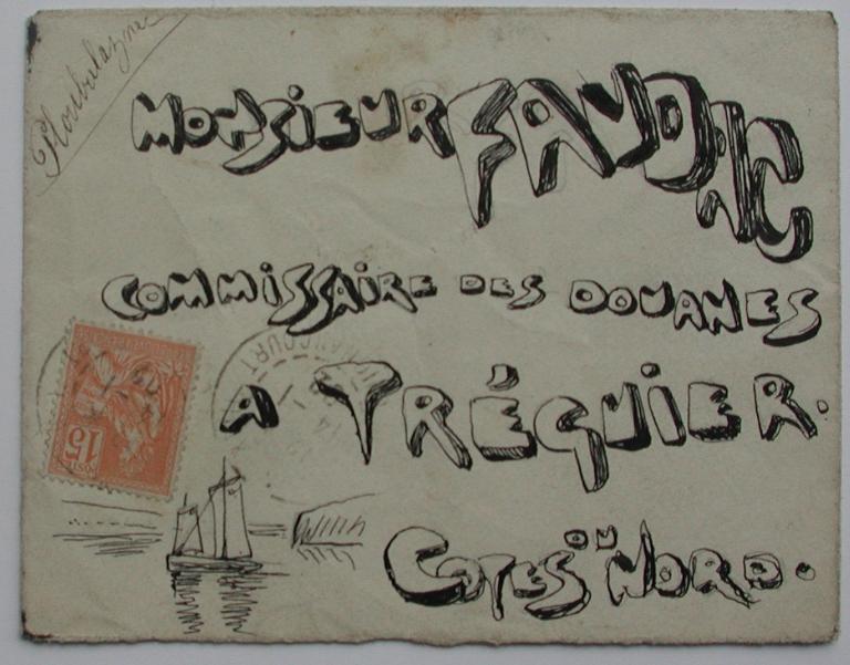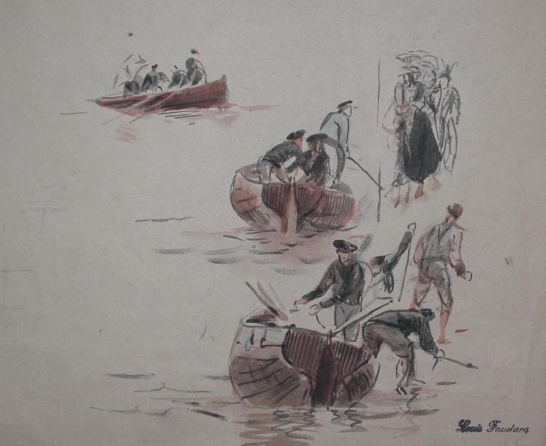 Cette fine et constante observation de la vie fluviale et maritime donnera au douanier Faudacq l’opportunité de dessiner les sabliers et goémoniers de l’estuaire, reconnaissables à leur cul pointu et à leur grande misaine très apiquée. Ce sont les seules représentations de ces bateaux datées de la fin du 19ème siècle jusqu’au 1er quart du 20e siècle, qui soient parvenues jusqu’à nous. Avec un équipage nombreux de 6 hommes, ces chaloupes non pontées descendent la rivière de Tréguier, par vent de suroît, en direction des îles d’Er, pour draguer le sable. La misaine, facile de manœuvre, amurée au pied de mât remplace pendant l’hiver le gréement à corne, plus utilisé en période estivale pour les métiers de la pêche. Manœuvrés avec de longs avirons ou karrenous, les sabliers viennent s’échouer à l’abri du Paluden.